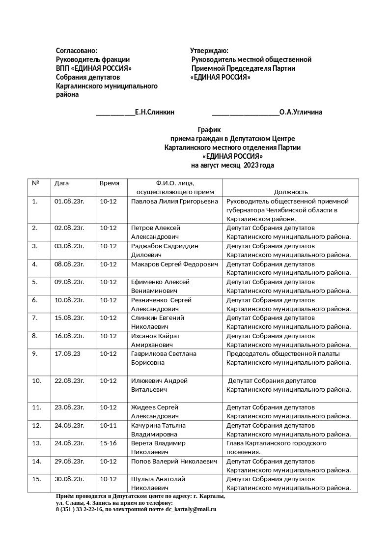 График приема граждан в Депутатском Центре Карталинского местного отделения Партии «ЕДИНАЯ РОССИЯ»